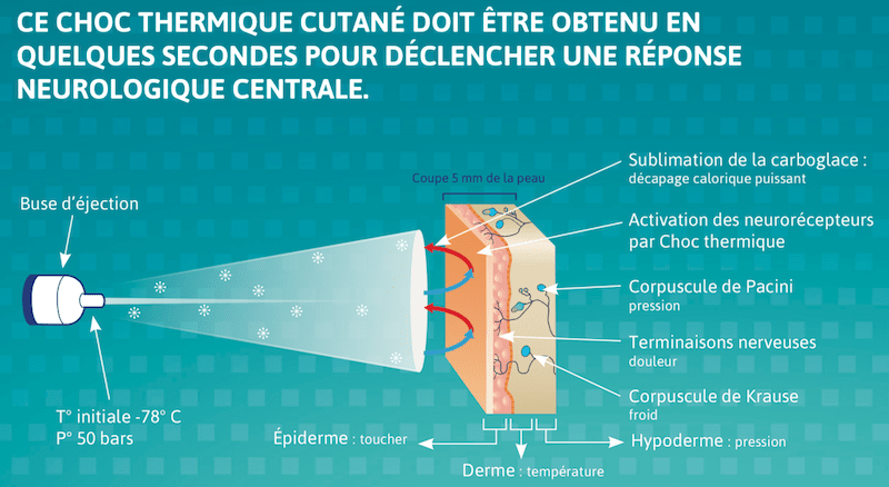 L’application du froid (env. -80 degrés) en pression est la seule technique à ce jour permettant d’agir en profondeur (jusqu’à 5 mm) pour agir notamment sur la douleur et favoriser la stimulation et réparation de la zone traitée.